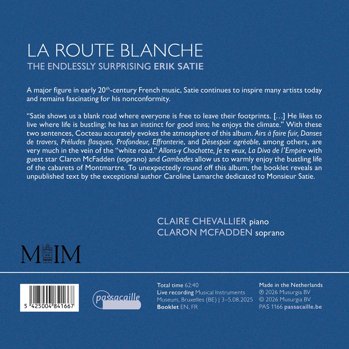 Een sleutelfiguur in de Franse muziek van het begin van de twintigste eeuw, blijft Satie vandaag vele kunstenaars inspireren en blijft hij fascineren door zijn non-conformisme. “Satie toont ons een witte weg waarop iedereen vrij is zijn voetsporen achter te laten. […] Hij leeft graag waar het leven bruist; hij heeft een instinct voor goede herbergen; hij houdt van het klimaat.” Met deze twee zinnen roept Cocteau treffend de sfeer van dit album op. Airs à faire fuir, Danses de travers, Préludes flasques, Profondeur, Effronterie en Désespoir agréable, onder andere, liggen geheel in het verlengde van de “witte weg”. Allons-y Chochotte, Je te veux, La Diva de l’Empire met gastsoliste Claron McFadden (sopraan) en Gambades laten ons warm genieten van het bruisende leven van de cabarets van Montmartre. Als onverwachte afsluiting onthult het cd-boekje een ongepubliceerde tekst van de uitzonderlijke schrijfster Caroline Lamarche, gewijd aan Monsieur Satie.